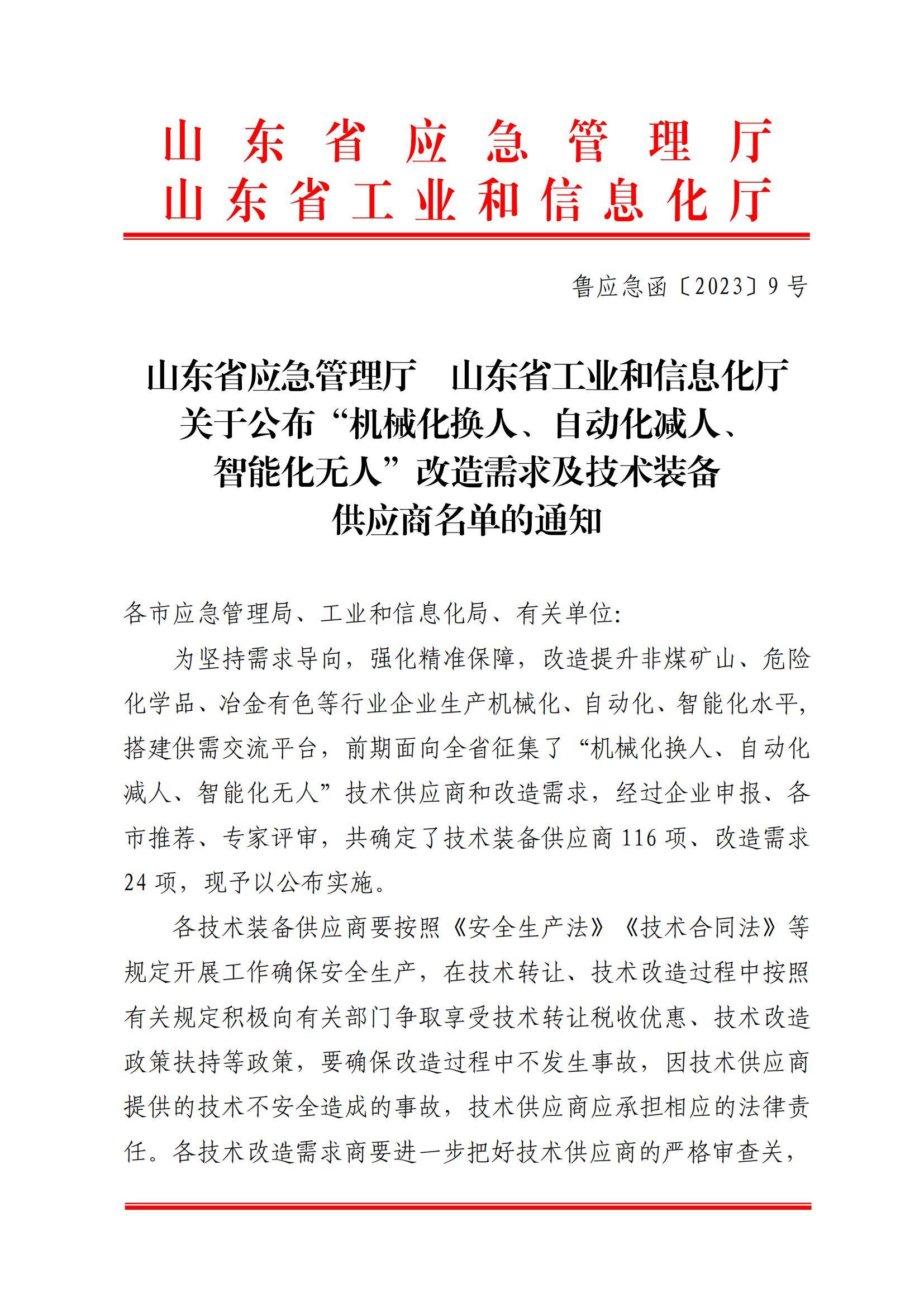 PG在线手机版(大中国区)入围“山东省应急管理厅 山东省工业和信息化厅“机械化换人、自动化减人、智能化无人”改造需求及技术装备供应商”
